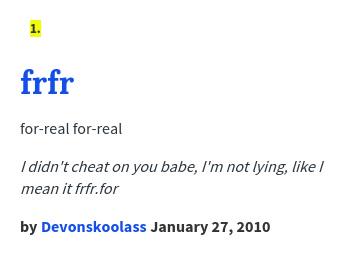 Frfr is an abbreviation for for real for real. Frfr, i loved tha carter 2 last year, he's almost as lit as lil pump! Your resource for web acronyms, web abbreviations and netspeak. In slang, frfr means for real for real. Frfr is a more emphatic version of fr.
